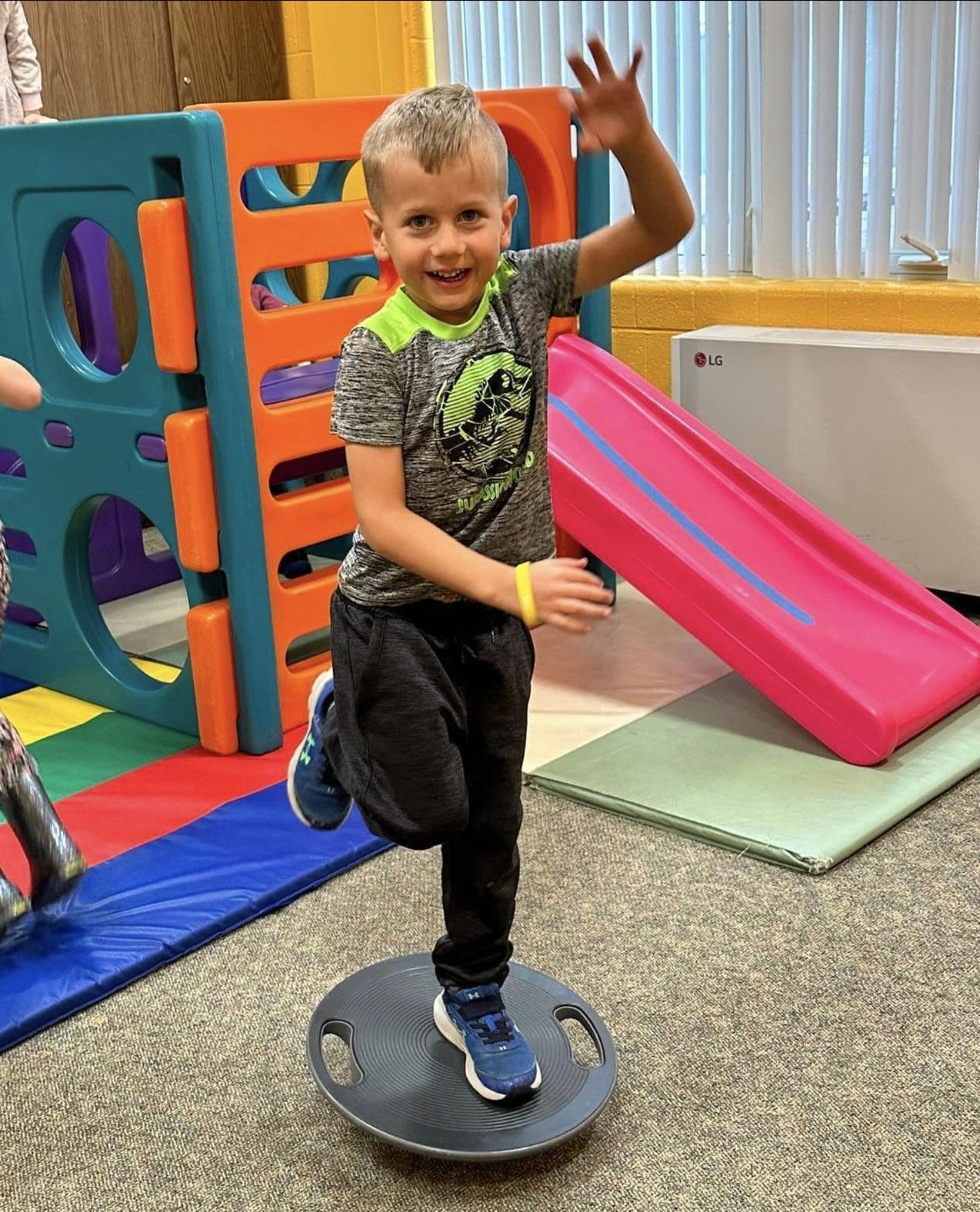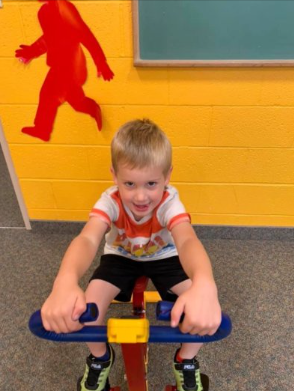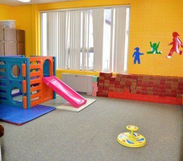 The motor room contains gross motor development equipment including a climber, large building blocks, exercise bikes, and other fun activities that change throughout the school year.